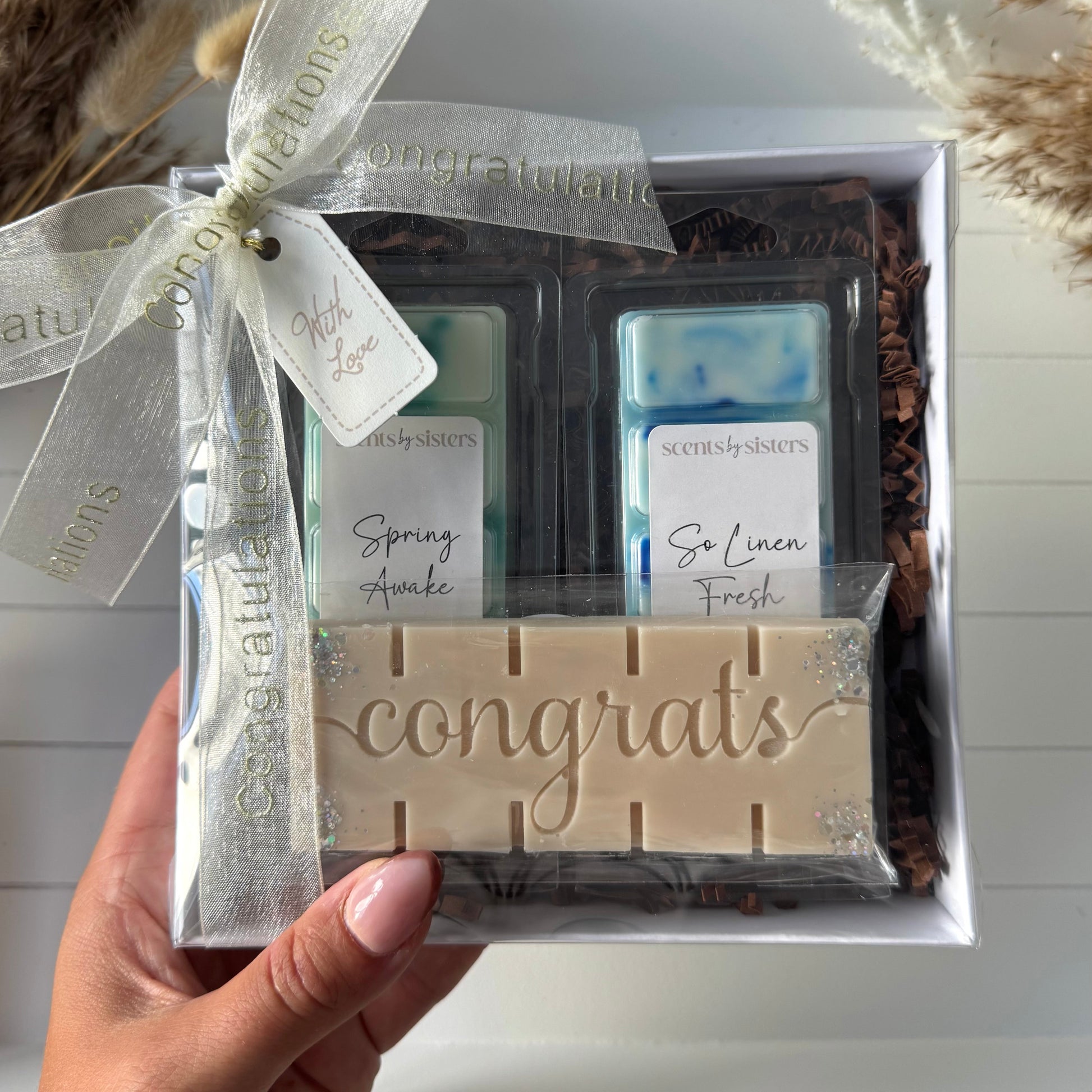 Our Congrats gift set contains a 'congrats' themed snap bar in the scent, Belle, plus two additional snap bars in either of the following scents: