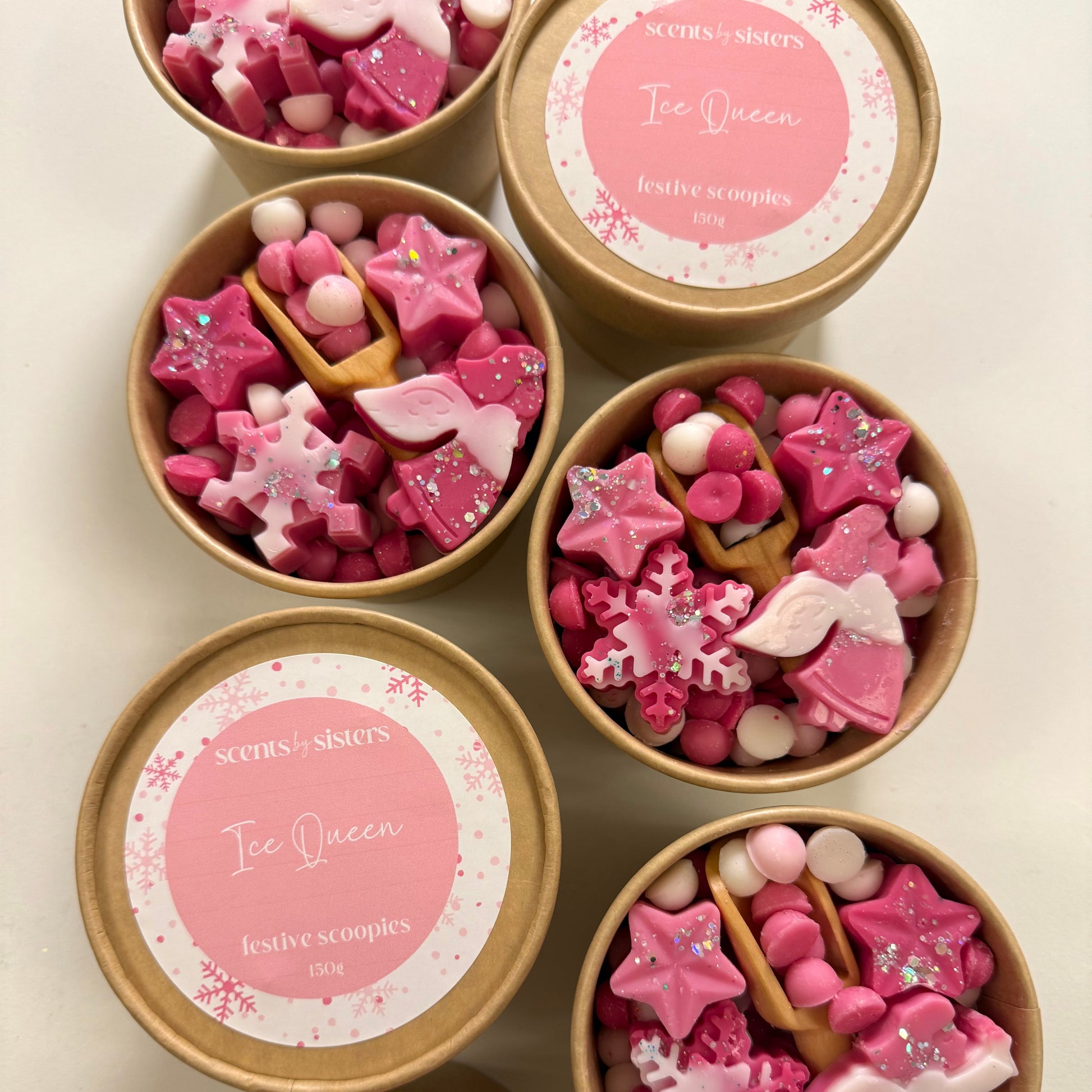 Our festive scoopie pots contain 160g of scoopies with a wooden spoon so you can scoop as you go.