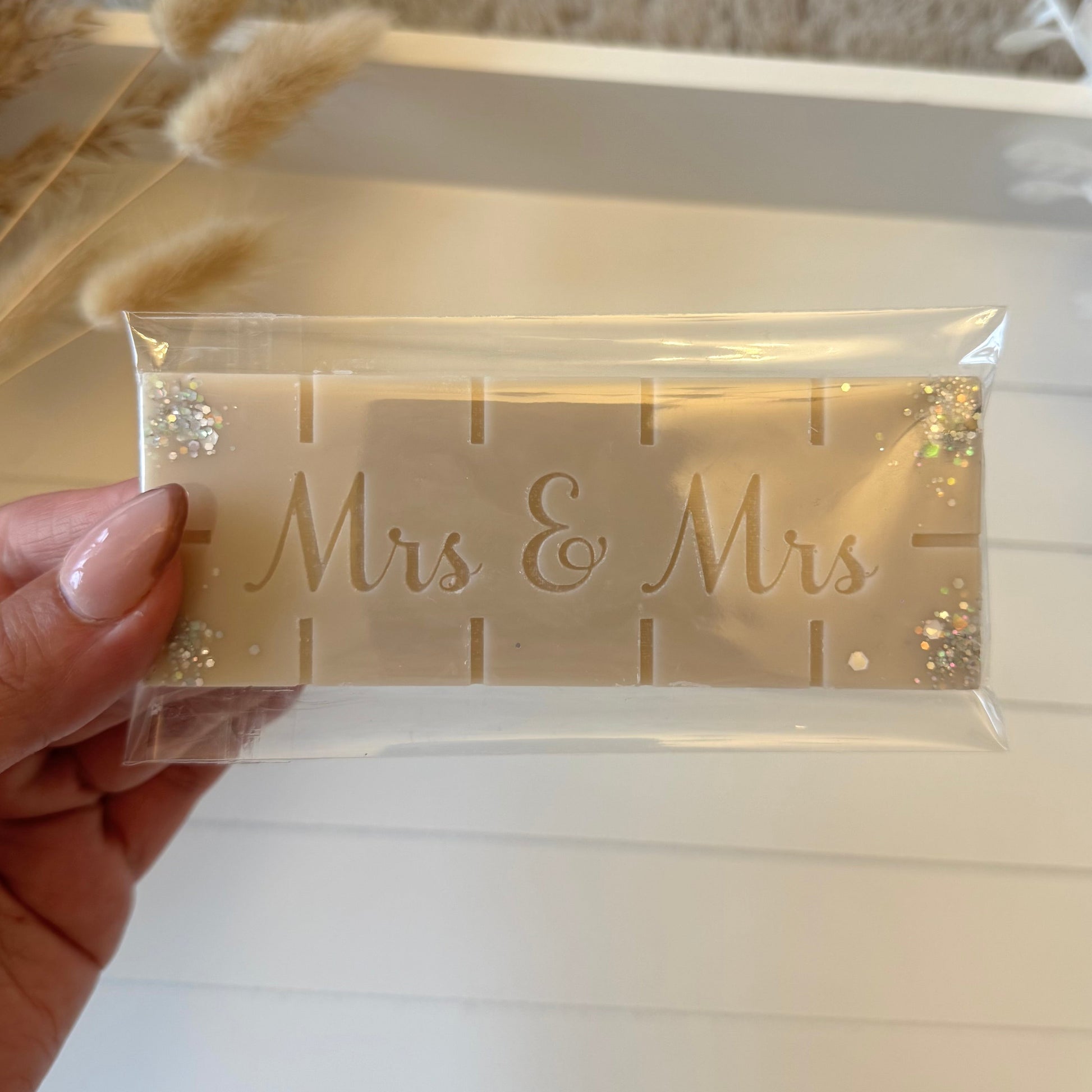 Our Mrs and Mrs themed snap bar contains approximately 50g of wax in the scent Belle.